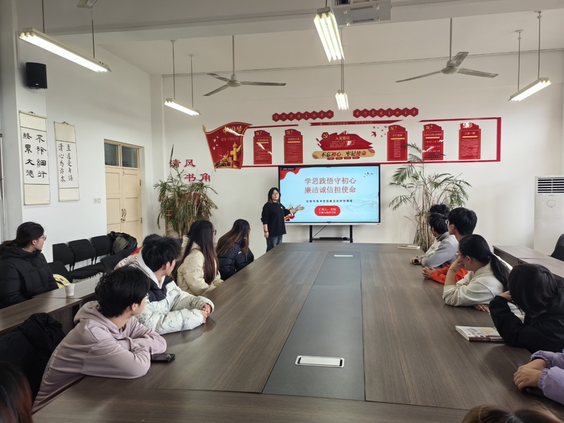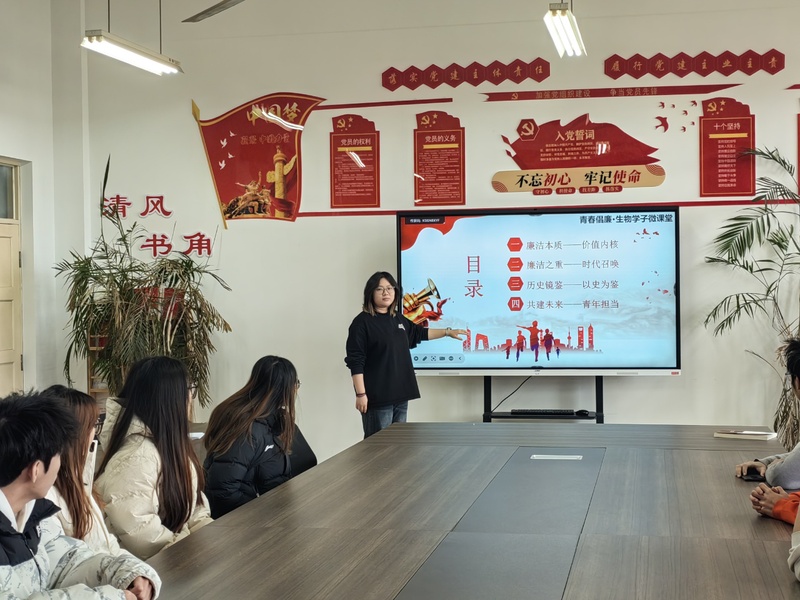 为厚植青年学生廉洁诚信理念,引导青年扣好人生“第一粒扣子”,生物与海洋学院开展“青春倡廉微课堂”活动。2025年11月26日,学生党支部预备党员史烁在8414会议室,以“学思践悟守初心,廉洁诚信担使命”为题,为所在班级生物科学专业2022级1班同学带来一堂生动深刻的廉洁教育课。