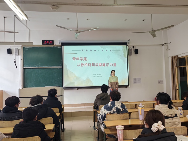 2024年12月23日,生物与海洋学院“青春倡廉微课堂”活动如期举行。学生党员陈业超以“从板桥诗句汲取廉洁力量”为题,为学院学生干部代表带来一堂别开生面的廉洁教育课,以经典为引筑牢青年干部廉洁根基。